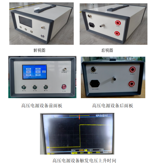 高压电源设备主要用于爆炸箔火工品的点火触发控制使用。该设备特点是电压范围大,既具备0-6000V可调电压输出为电容充电的功能,又具备0-4000V可调输出驱动爆炸箔点火控制触发管的功能。